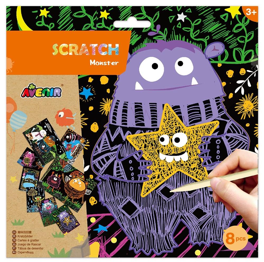 Wydrapywanki Potworki marki Avenir pozwalają na oryginalną kreatywna zabawę. Zdrapywanie stron specjalnym patyczkiem do nowe wrażenie dotykowe i sensoryczne. Ukazujące się w trakcie zdrapywania kolorowe obrazki dają satysfakcję, przyjemność z zabawy i ćwiczą zdolności motoryczne dziecka.