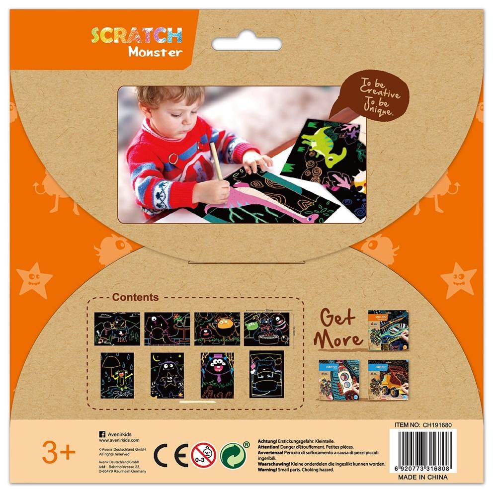 W zestawie: 8 wydrapywanek z sympatycznymi potworkami, patyczek do zdrapywania.
