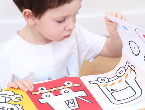 W 2 dłuuugich książeczkach harmonijkach znajdują się łącznie 23 proste ilustracje z grubymi obrysami.