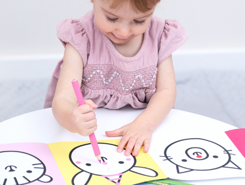 W zestawie znajdują się 2 długie, dwustronne malowanki do rysowania i kolorowania, których forma i ilustracje dostosowano do wieku najmłodszych artystów.